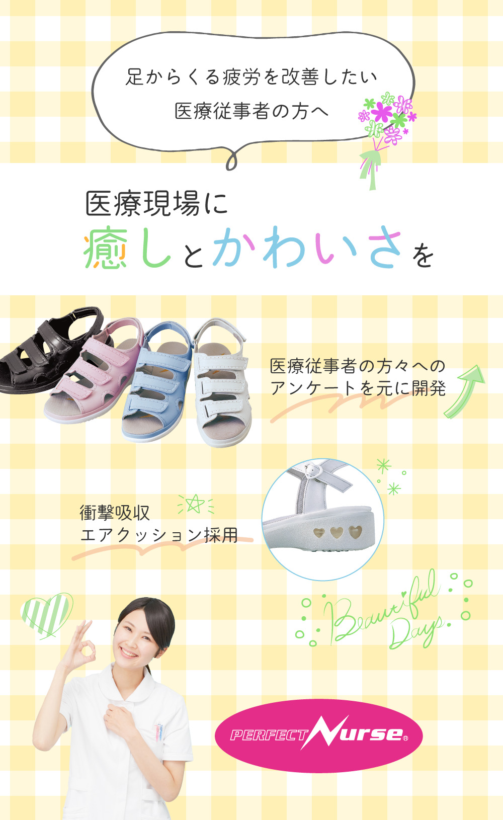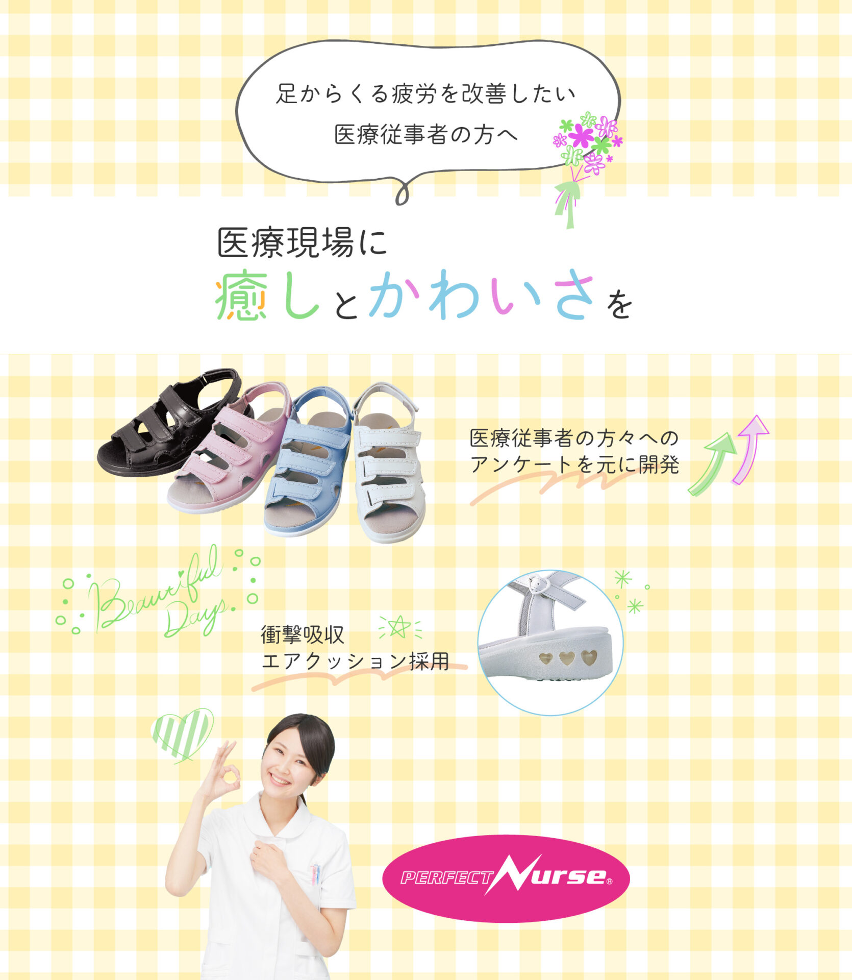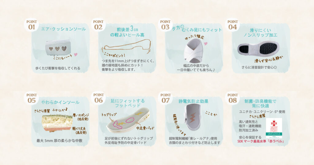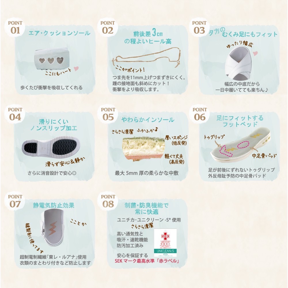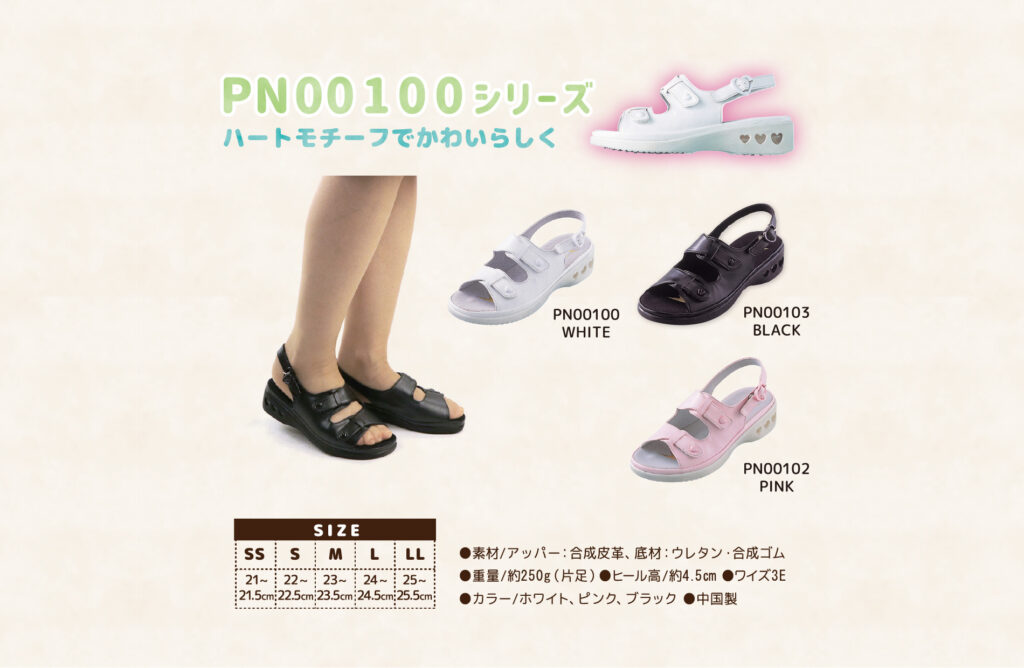 ラインナップ PN100 SERIES ハートモチーフがとってもキュート 品 番PN00100(ホワイト) / PN00102(ピンク) / PN00103(ブラック)重 さ約250g ※片足Mサイズカラーホワイト / ピンク / ブラックサイズSS(21~21.5㎝) / S(22.0~22.5㎝)M(23.0~23.5㎝) / L(24.0~24.5㎝) /LL(25.0~25.5㎝)ワイズEEEヒール高約4.5㎝材 質合成皮革、合成繊維(制菌加工)、合成底 商品を購入する PN200 SERIES 足入れしやすい定番のクロスベルト 品 番PN00200(ホワイト) / PN00202(ピンク) / PN00203(ブラック)重 さ約250g ※片足Mサイズカラーホワイト / ピンク / ブラックサイズSS(21~21.5㎝) / S(22.0~22.5㎝)M(23.0~23.5㎝) / L(24.0~24.5㎝) /LL(25.0~25.5㎝)ワイズEEEヒール高約4.5㎝材 質合成皮革、合成繊維(制菌加工)、合成底 商品を購入する プライバシーポリシー特定商取引に基づく表記利用規約 ご購入はこちらから!詳細